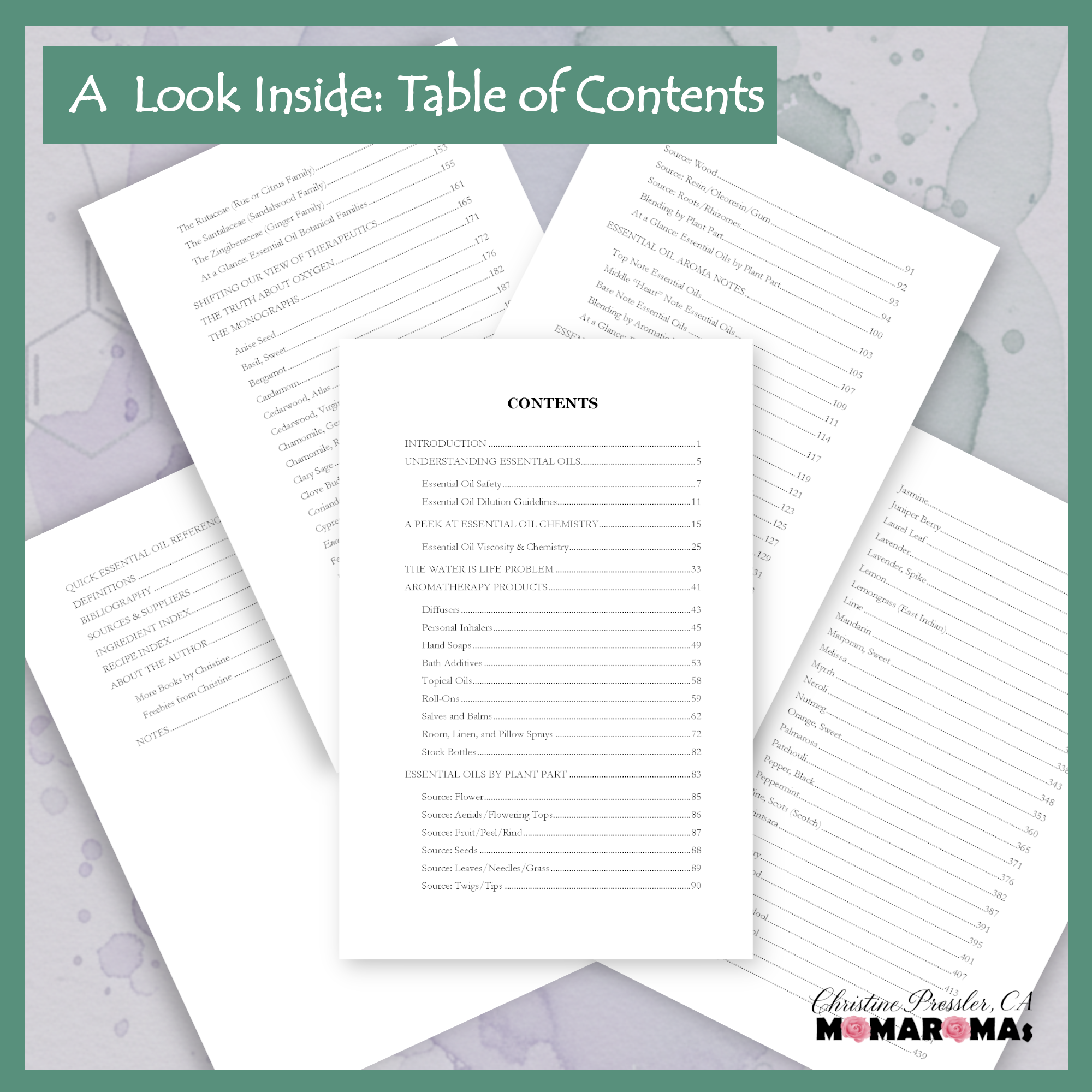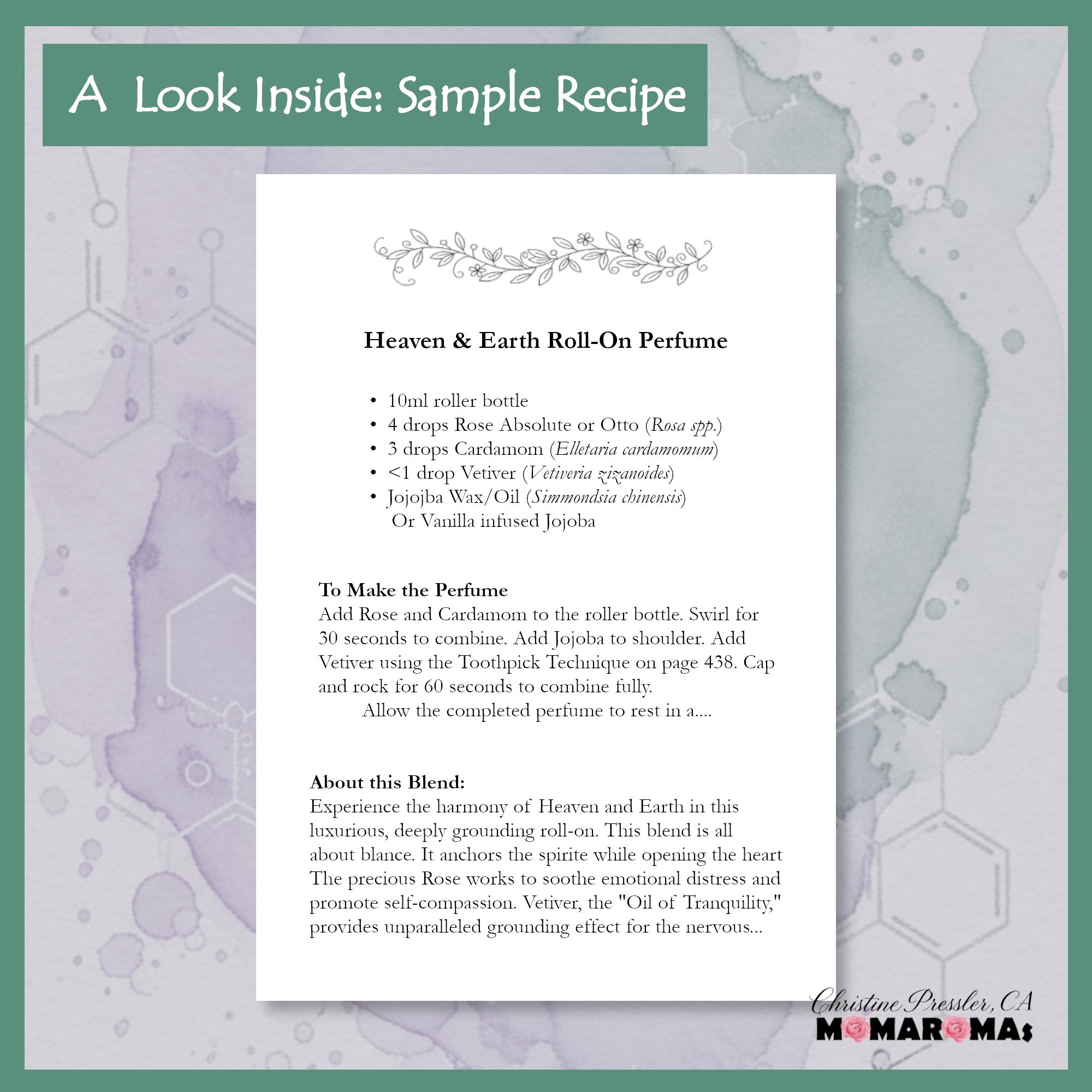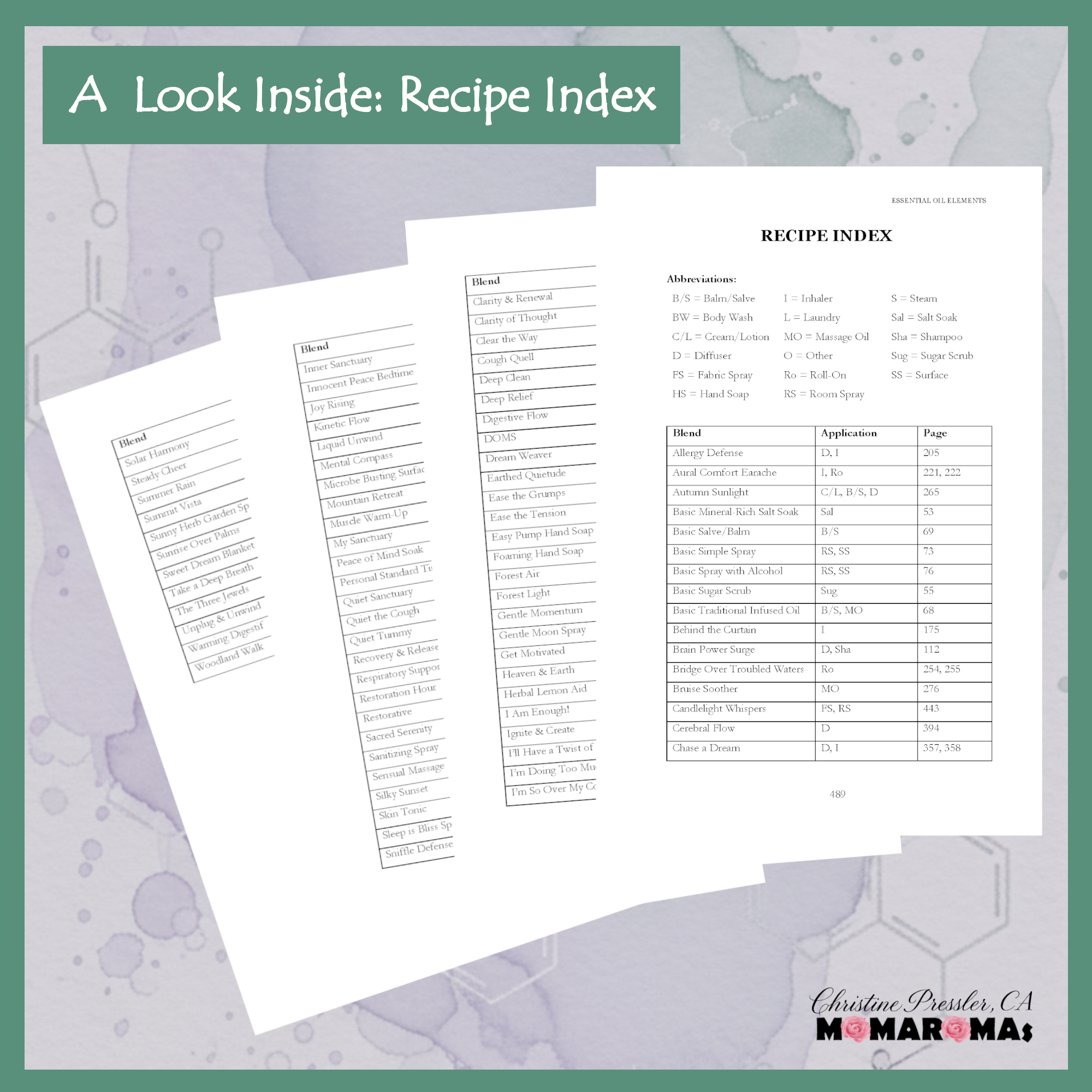 Over 120 Professional Recipes, including diffuser blends, inhaler blends, massage oils, roll-ons, room & fabric sprays, hand soaps, body washes, and scrubs. And dozens of additional blending suggestions!